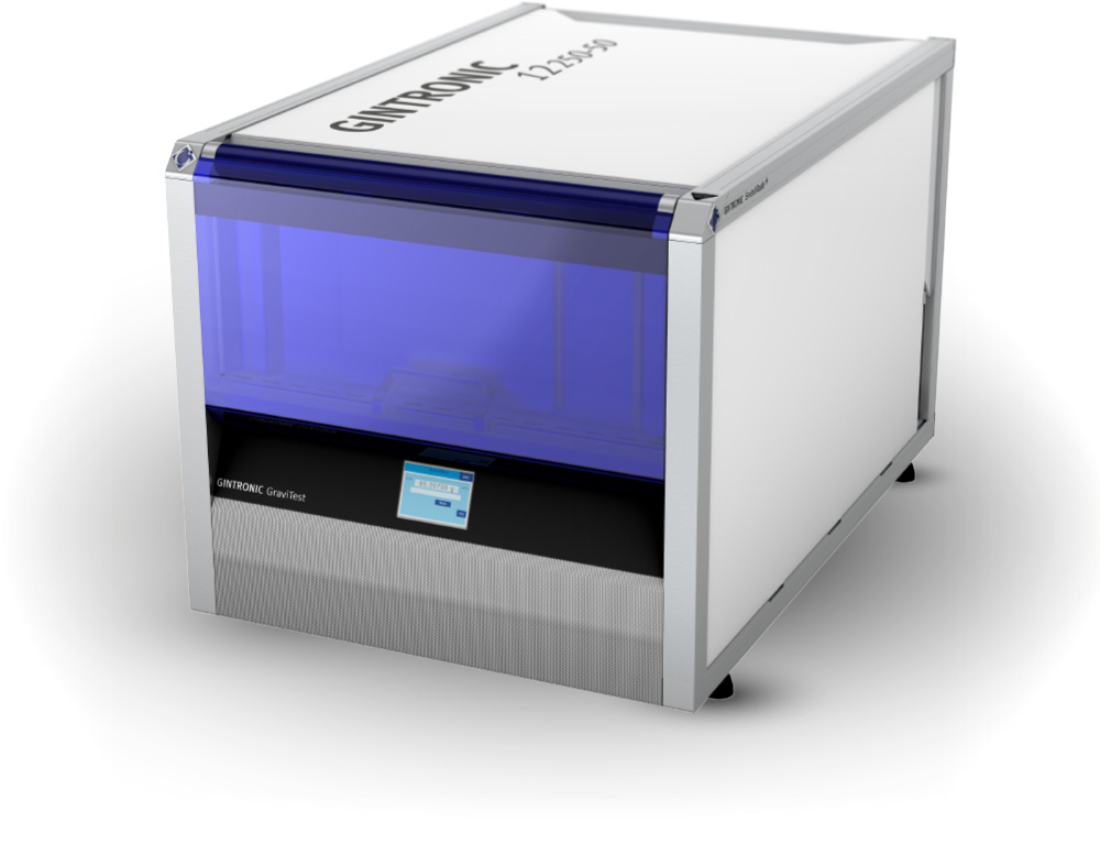 Mit der GINTRONIC GraviTest 12000er-Serie hat die GINTRONIC AG die gravimetrische Bestimmung der Wasserdampfdurchlässigkeit von Polymerfolien und anderen Plattenmaterialien auf eine neue Stufe gestellt. GraviTest bietet eine einfache Probenvorbereitung, eine benutzerfreundliche GraviCommander Pc Software und die vollständige Automatisierung des Messprozesses. Dies, in Kombination mit der genauen und robusten Waage, ermöglicht für die hochpräzise gravimetrische Messung der Wasserdampfdurchlässigkeit, mit einem Minimum an Zeitaufwand für den Anwender, wird die gravimetrische Methode zum Kinderspiel.